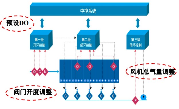 智能精确曝气系统是将在线仪表及阀门和鼓风机控制集成到一个智能化的控制系统当中,通过动态地优化与调整供气量, 尽量做到按需供气, 从而达到稳定污水厂出水水质和节能的目的。