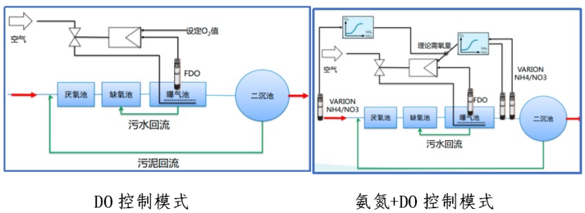 在线仪表之前以溶解氧为控制手段,改为氨氮为直接控制,溶解氧辅助控制的更为先进的智能化方案,可以精准控制曝气,大大降低电力的消耗。