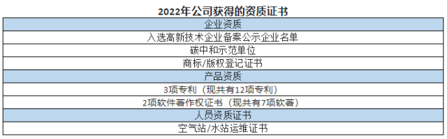 2022年我司获得多项专利、软著及资质证书,公司将以本次入选高新技术企业备案公示企业名单为契机,进一步加大产品研发投入,充分发挥自身优势,通过技术、产品、业务及管理模式的不断创新,持续提升企业核心竞争力,为生态文明建设做出更大的贡献。